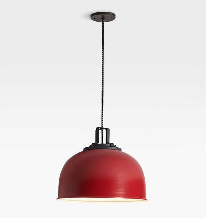 A large dome shade features a streamlined silhouette for our Butte Pendant, complete with an oil-rubbed bronze fixture and a cloth-covered cord. Each shade is made with high-quality spun aluminum, then customized to your specifications at our Portland, Oregon factory.